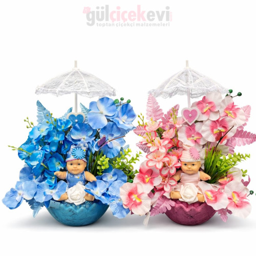 Bebek tanzimleri için özel tasarlanmış Hoş Geldin Bebek aranjmanı. Çiçekçiler için ideal, vitrin ve siparişlere uygun, şık ve hazır bebek çiçeği modeli.