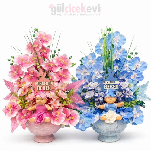 Bebek tanzimleri için özel tasarlanmış Hoş Geldin Bebek aranjmanı. Çiçekçiler için ideal, vitrin ve siparişlere uygun, şık ve hazır bebek çiçeği modeli.