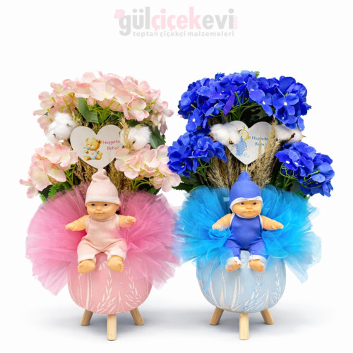 Bebek tanzimleri için özel tasarlanmış Hoş Geldin Bebek aranjmanı. Çiçekçiler için ideal, vitrin ve siparişlere uygun, şık ve hazır bebek çiçeği modeli.