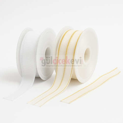 Altın şeritli dekoratif kurdele; buket tasarımları, çelenk süslemeleri, gelin çiçekleri ve aranjman çalışmalarında çiçekçilerin en şık tercihidir.