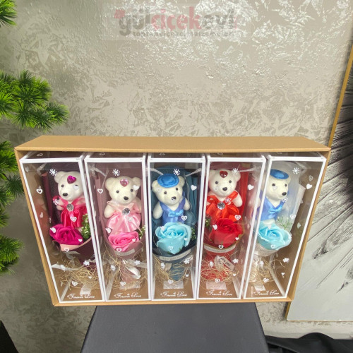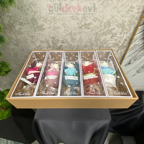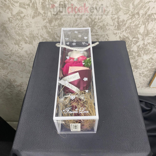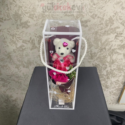 Şeffaf özel kutu içerisinde sunulan ayıcık figürlü yapay gül buketi, romantik ve zarif bir hediye alternatifi sunar. Yapay gül, dekoratif yeşillik ve sevimli ayıcık detayıyla hazırlanan bu aranjman; Sevgililer Günü, doğum günü ve özel günlerde uzun ömürlü bir hatıra olarak tercih edilir. Çiçekçiler ve hediyelik ürün satışı yapanlar için vitrin ve paket sunumuna uygundur.