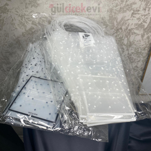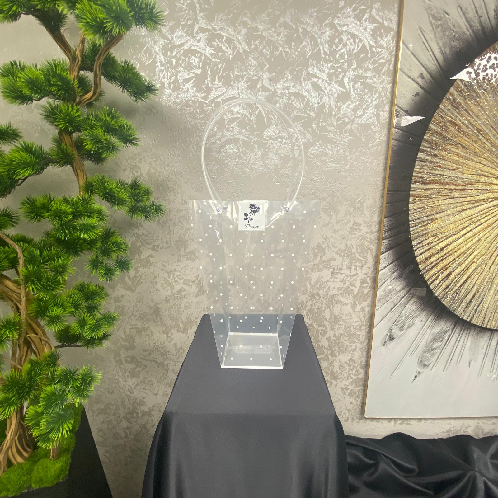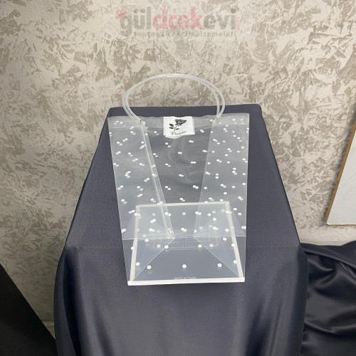 Puantiyeli şeffaf hediye çantası; çiçek aranjmanları, buketler ve özel gün sunumları için estetik ve modern bir ambalaj çözümüdür. Şeffaf yüzeyi üzerindeki dekoratif desenler sayesinde içeriği zarif bir şekilde ön plana çıkarır. Sağlam tabanı formunu korurken, dayanıklı kulpu sayesinde taşıması pratiktir. Çiçekçiler, organizasyon firmaları ve hediyelik ürün sunumları için ideal bir tamamlayıcıdır.