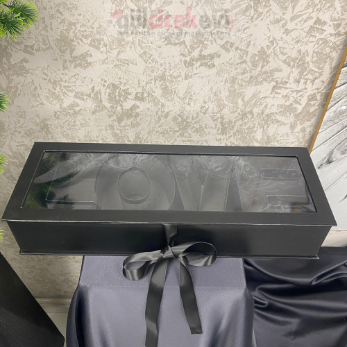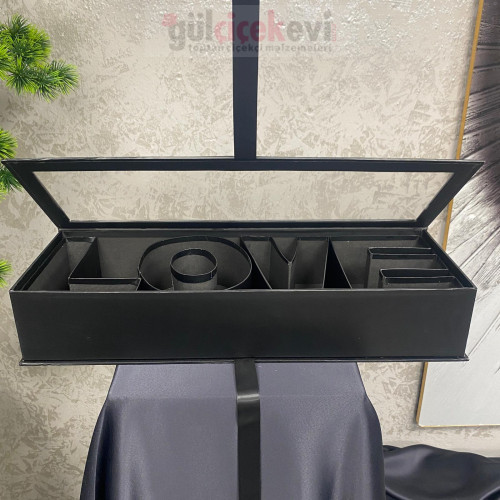 Şık ve modern tasarımıyla öne çıkan LOVE konseptli bu özel kutu, içi ister yapay dilerseniz canlı güllerle doldurulmuş dekoratif bir hediye sunumudur. Mat siyah kutu yapısı ve şeffaf kapak detayı sayesinde iç tasarım estetik şekilde sergilenir. Sevgililer Günü, yıldönümü, doğum günü ve özel günlerde romantik ve anlamlı bir hediye alternatifi sunar. Çiçekçiler ve butik hediyelik ürün sunumları için ideal, uzun ömürlü ve dikkat çekici bir konsept üründür.