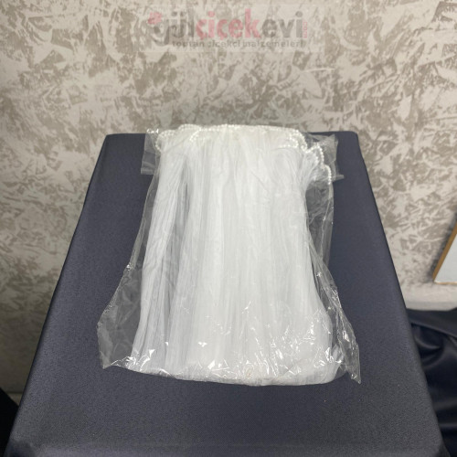 Boncuk kenar detayına sahip bu şık buket tülü, çiçek aranjmanlarına zarif ve romantik bir görünüm kazandırmak için tasarlanmıştır. İnce piliseli yapısı sayesinde buket etrafına kolayca sarılır ve hacimli bir sunum sağlar.